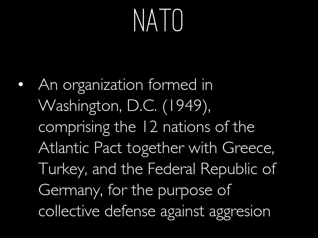 An organization formed in Washington, D.C. (1949), comprising the 12 nations of the Atlantic Pact together with Greece, Turkey, and the Federal Republic of Germany, for the purpose of collective defense against aggresion