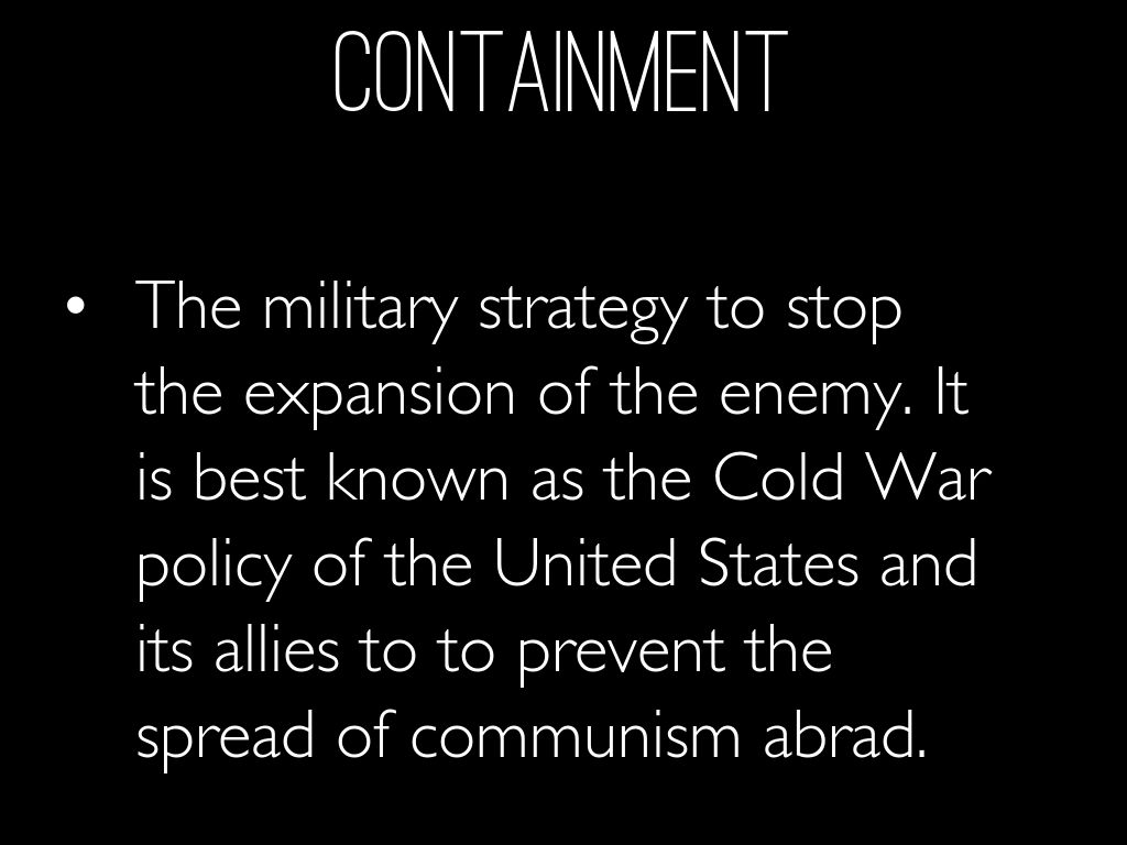 The military strategy to stop the expansion of the enemy. It is best known as the Cold War policy of the United States and its allies to to prevent the spread of communism abrad.