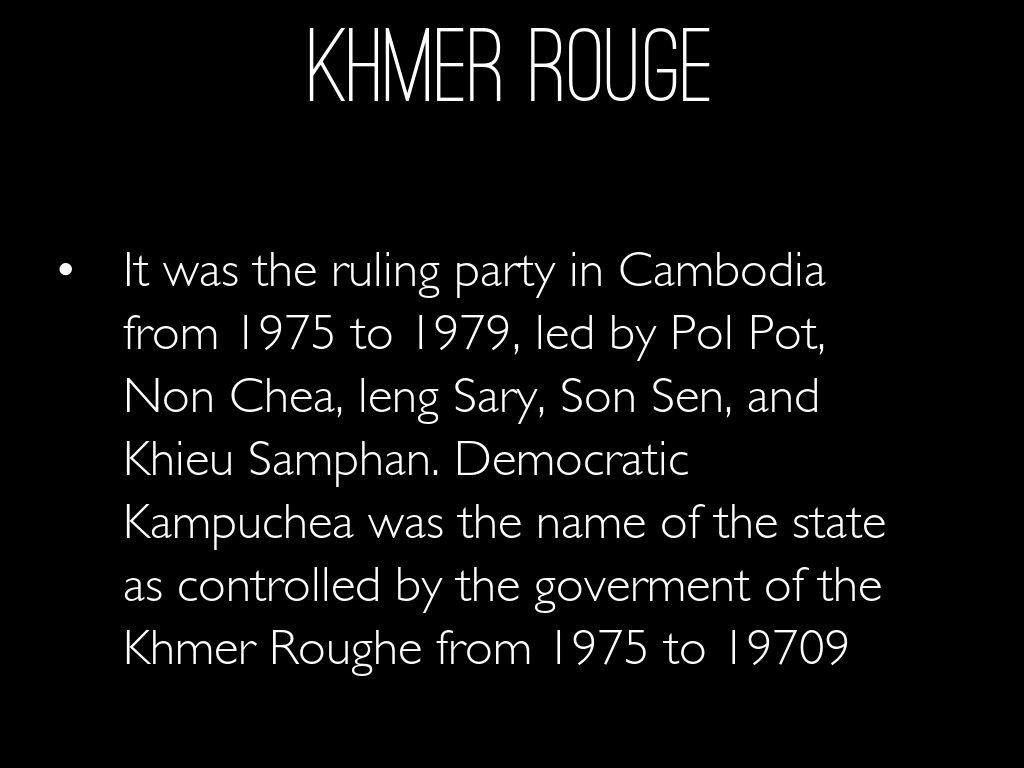 It was the ruling party in Cambodia from 1975 to 1979, led by Pol Pot, Non Chea, leng Sary, Son Sen, and Khieu Samphan. Democratic Kampuchea was the name of the state as controlled by the goverment of the Khmer Roughe from 1975 to 19709