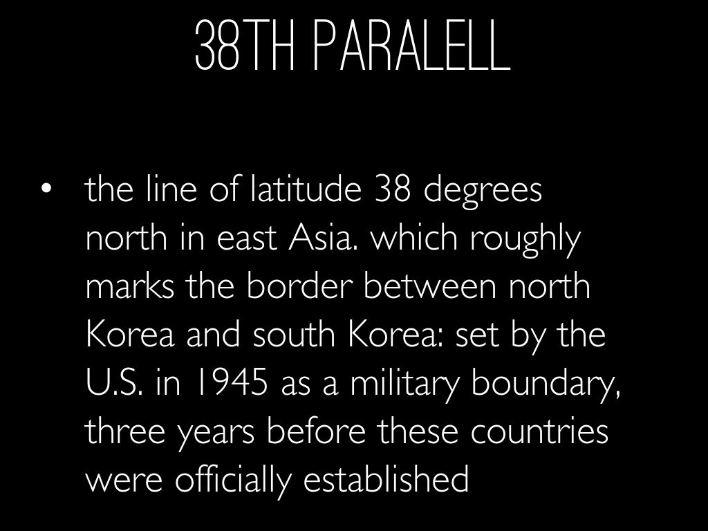 the line of latitude 38 degrees north in east Asia. which roughly marks the border between north Korea and south Korea: set by the U.S. in 1945 as a military boundary, three years before these countries were officially established
