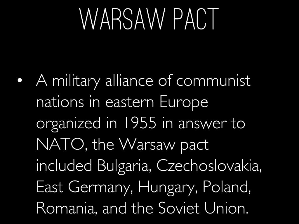 A military alliance of communist nations in eastern Europe organized in 1955 in answer to NATO, the Warsaw pact included Bulgaria, Czechoslovakia, East Germany, Hungary, Poland, Romania, and the Soviet Union.