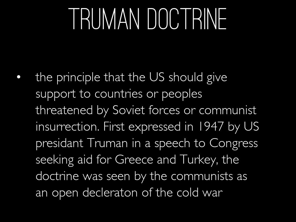 the principle that the US should give support to countries or peoples threatened by Soviet forces or communist insurrection. First expressed in 1947 by US presidant Truman in a speech to Congress seeking aid for Greece and Turkey, the doctrine was seen by the communists as an open decleraton of the cold war