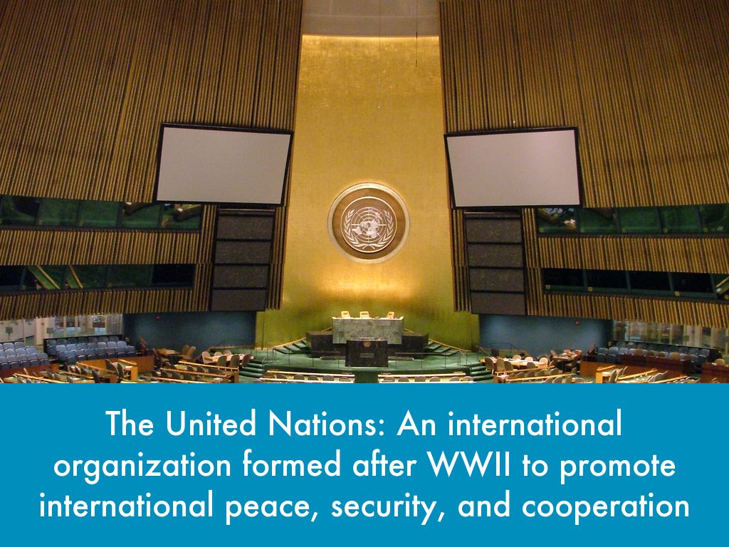 The United Nations: An international organization formed after WWII to promote international peace, security, and cooperation