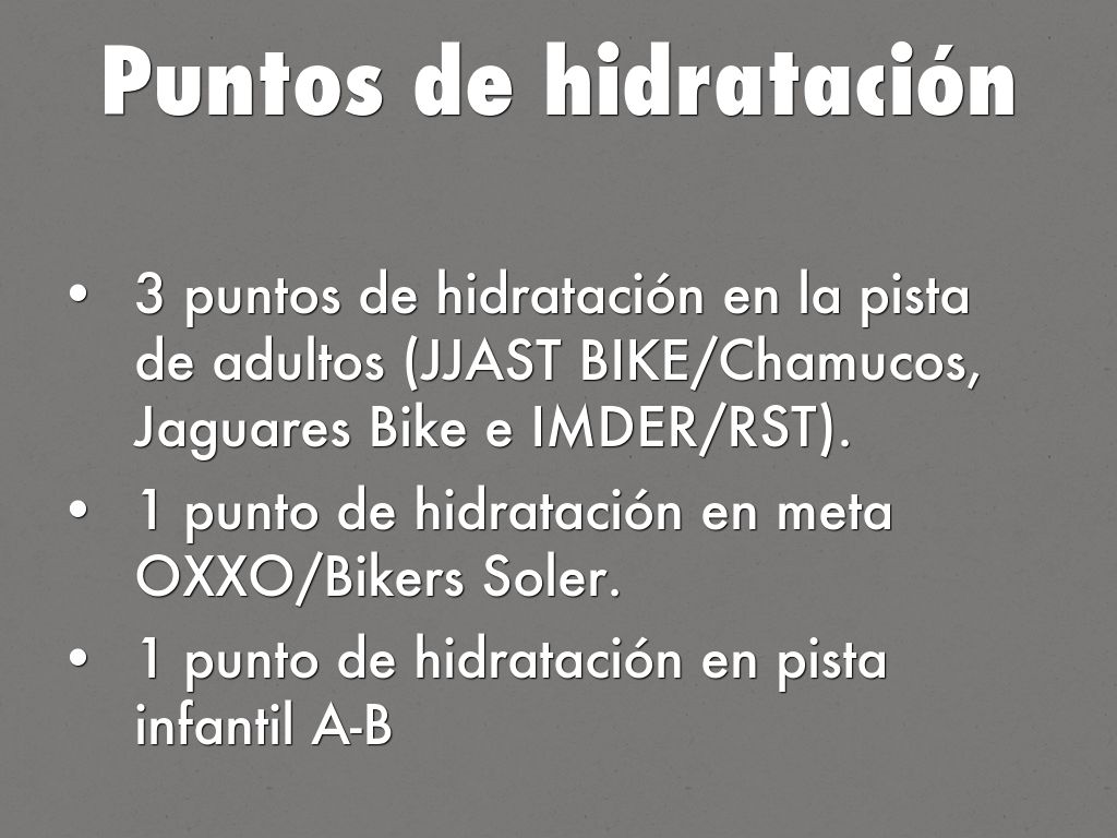 3 puntos de hidratación en la pista de adultos (JJAST BIKE/Chamucos, Jaguares Bike e IMDER/RST).