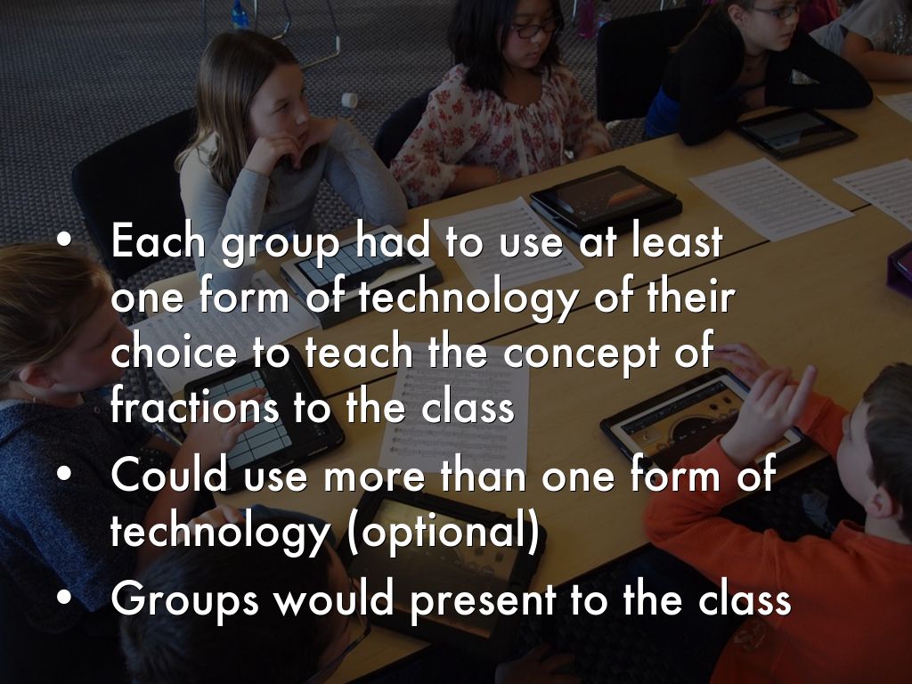 In this lesson, the students are given the assignment of creating a presentation to teach adding or subtracting fractions to the class as a review of what they have previously learned. The link to the video is: