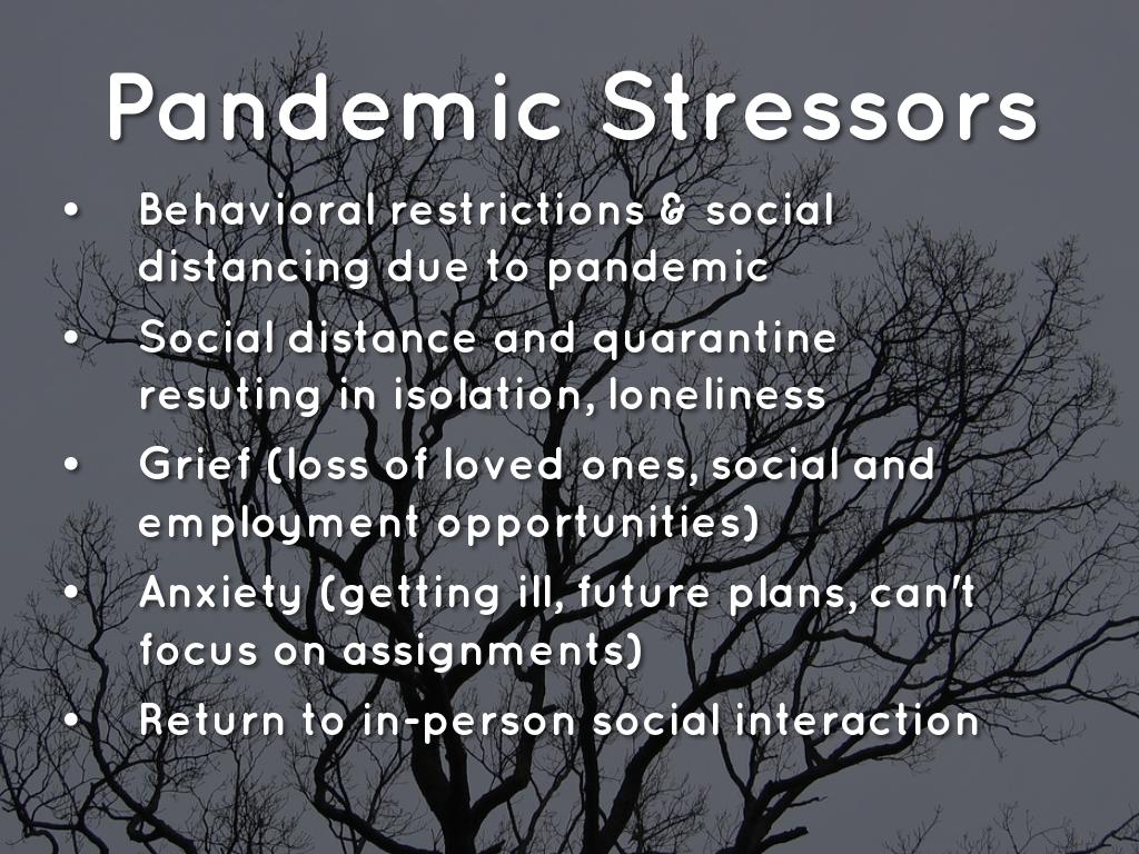 2. COVID-19 called on people to exercise behavioral restrictions and social distancing. Because of them, in early stage of the pandemic of COVID-19, many students faced a sustained emotional burden and were experiencing increased levels of stress, isolation, and loneliness, as well as grief and anxiety, related to disruption of routines, and future plans.