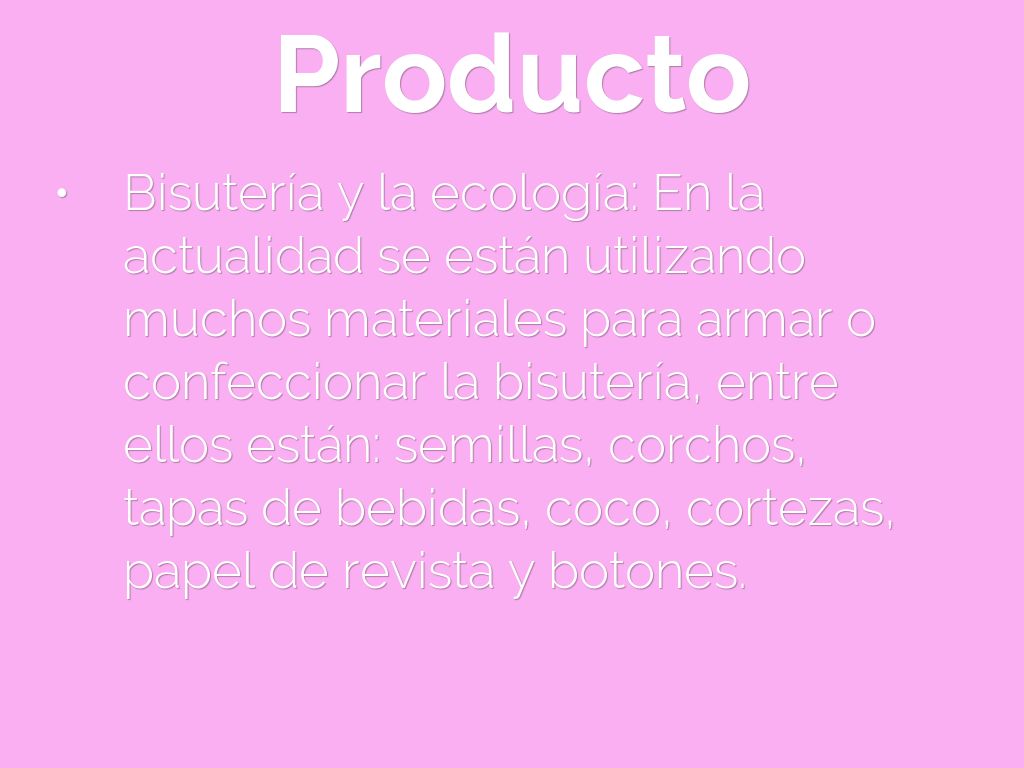 Bisutería y la ecología: En la actualidad se están utilizando muchos materiales para armar o confeccionar la bisutería, entre ellos están: semillas, corchos, tapas de bebidas, coco, cortezas, papel de revista y botones.
