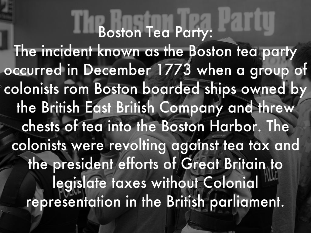 Boston Tea Party: The incident known as the Boston tea party occurred in December 1773 when a group of colonists rom Boston boarded ships owned by the British East British Company and threw chests of tea into the Boston Harbor. The colonists were revolting against tea tax and the president efforts of Great Britain to legislate taxes without Colonial representation in the British parliament.