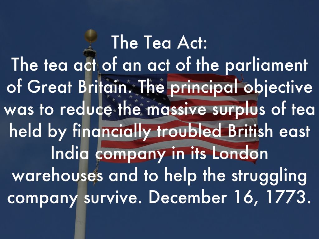 The Tea Act: The tea act of an act of the parliament of Great Britain. The principal objective was to reduce the massive surplus of tea held by financially troubled British east India company in its London warehouses and to help the struggling company survive. December 16, 1773.