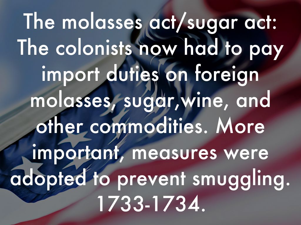 The molasses act/sugar act: The colonists now had to pay import duties on foreign molasses, sugar,wine, and other commodities. More important, measures were adopted to prevent smuggling. 1733-1734.