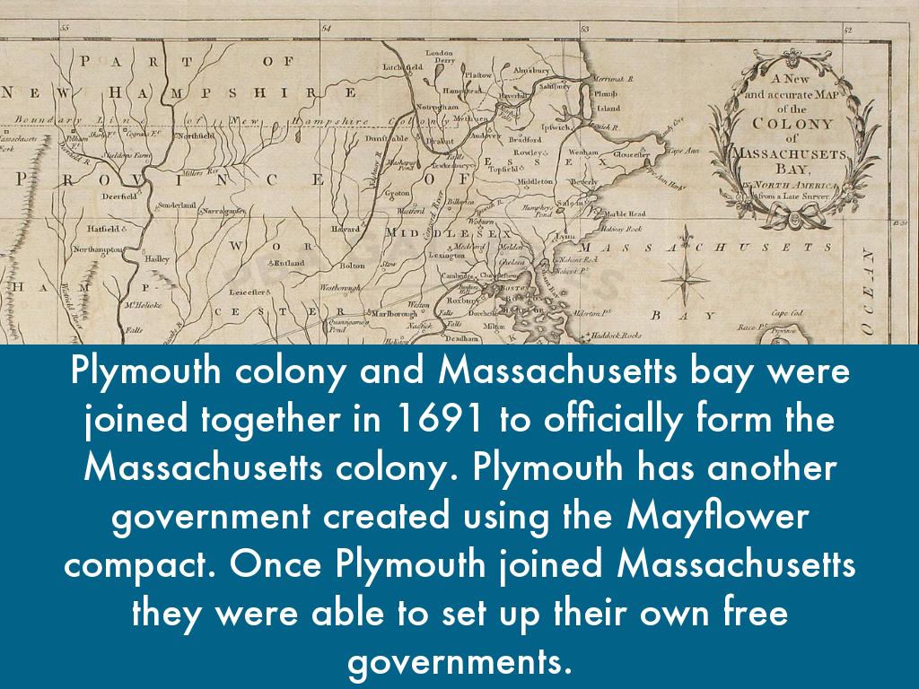 Plymouth colony and Massachusetts bay were joined together in 1691 to officially form the Massachusetts colony. Plymouth has another government created using the Mayflower compact. Once Plymouth joined Massachusetts they were able to set up their own free governments.