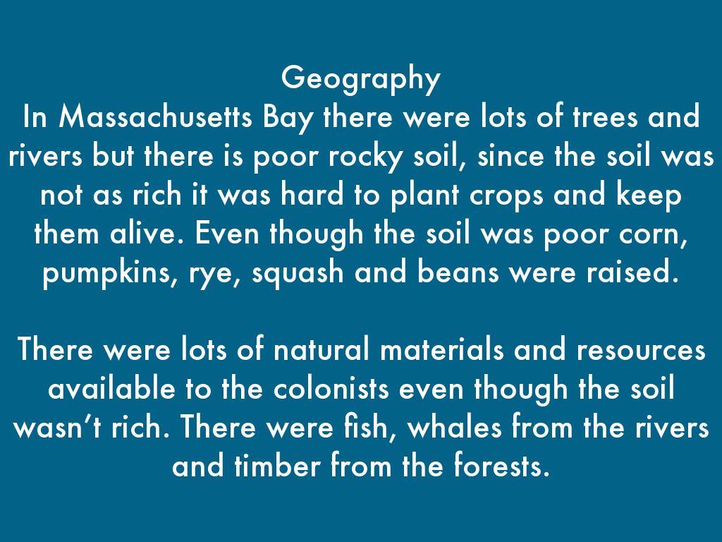 In Massachusetts Bay there were lots of trees and rivers but there is poor rocky soil, since the soil was not as rich it was hard to plant crops and keep them alive. Even though the soil was poor corn, pumpkins, rye, squash and beans were raised.