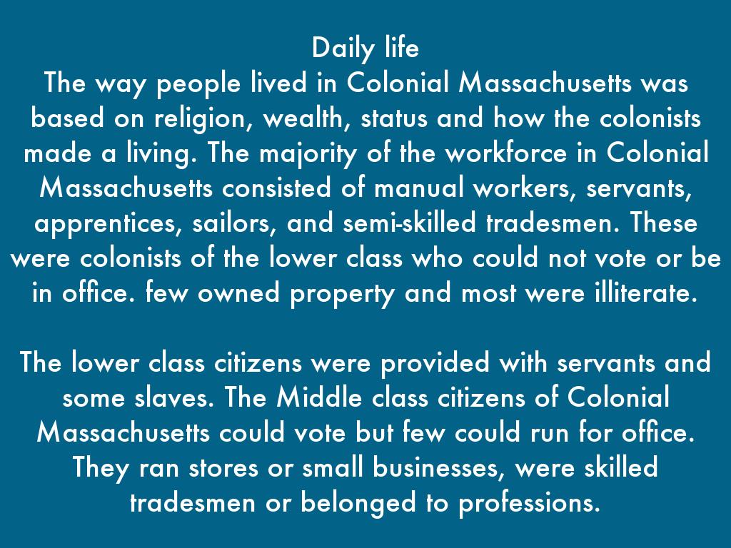 The way people lived in Colonial Massachusetts was based on religion, wealth, status and how the colonists made a living. The majority of the workforce in Colonial Massachusetts consisted of manual workers, servants, apprentices, sailors, and semi-skilled tradesmen. These were colonists of the lower class who could not vote or be in office. few owned property and most were illiterate.