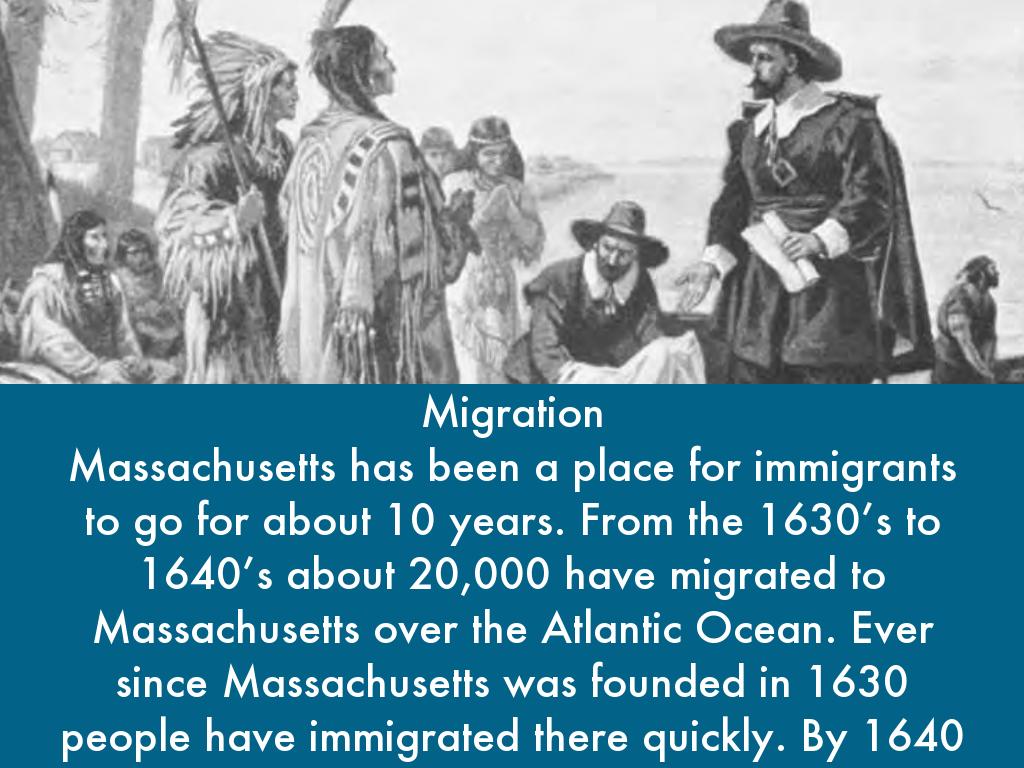 Massachusetts has been a place for immigrants to go for about 10 years. From the 1630’s to 1640’s about 20,000 have migrated to Massachusetts over the Atlantic Ocean. Ever since Massachusetts was founded in 1630 people have immigrated there quickly. By 1640 more than 40,000 of the English colonists had moved to Massachusetts bay.