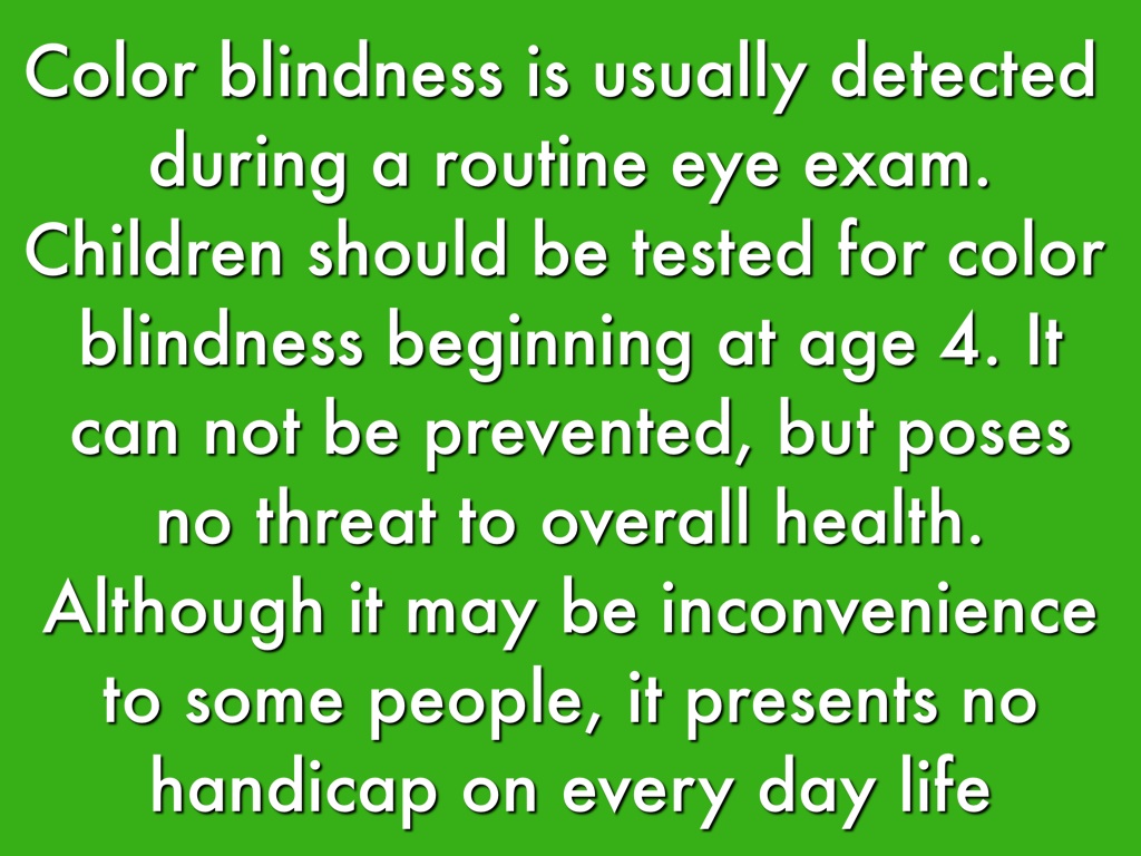 Color blindness is usually detected during a routine eye exam. Children should be tested for color blindness beginning at age 4. It can not be prevented, but poses no threat to overall health. Although it may be inconvenience to some people, it presents no handicap on every day life