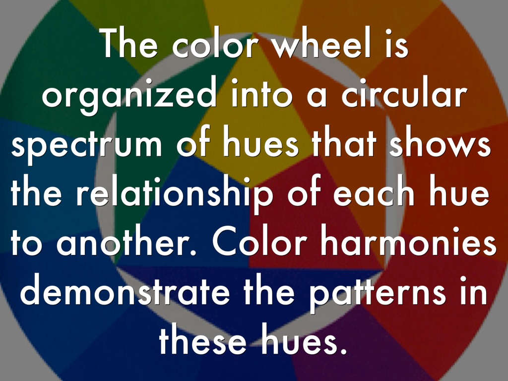 The color wheel is organized into a circular spectrum of hues that shows the relationship of each hue to another. Color harmonies demonstrate the patterns in these hues.