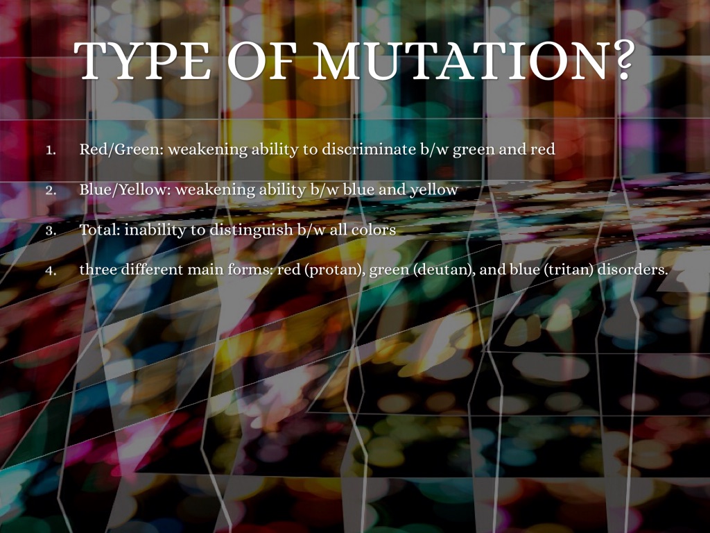 three different main forms: red (protan), green (deutan), and blue (tritan) disorders.