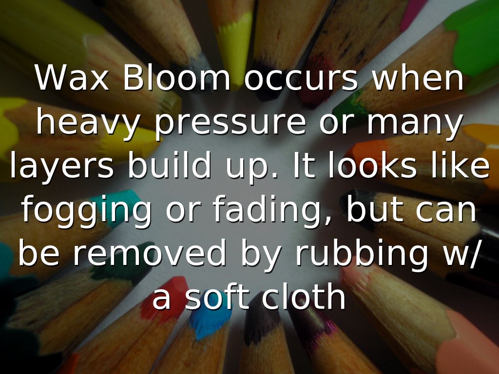 Wax Bloom occurs when heavy pressure or many layers build up. It looks like fogging or fading, but can be removed by rubbing w/ a soft cloth