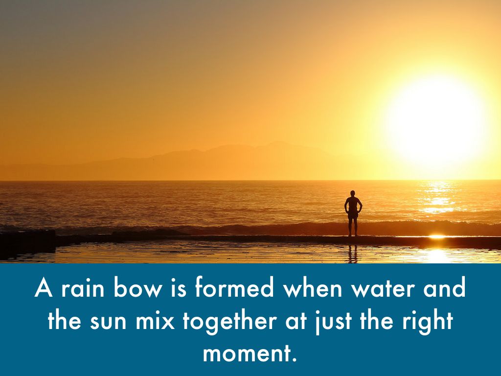 A rain bow is formed when water and the sun mix together at just the right moment.