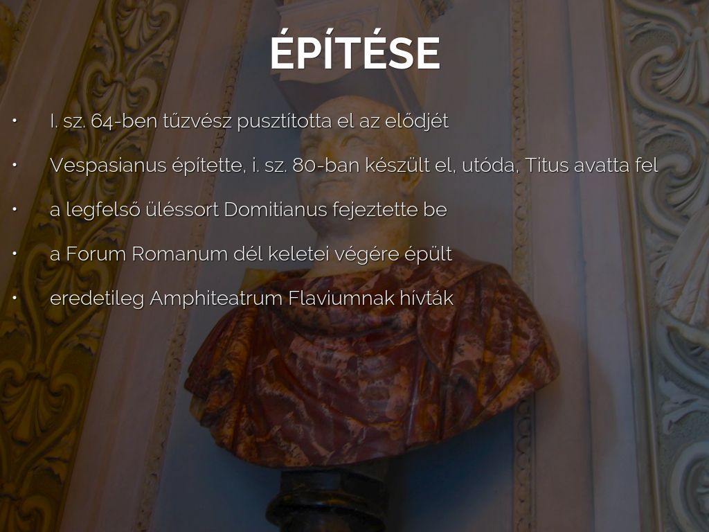 Vespasianus építette, i. sz. 80-ban készült el, utóda, Titus avatta fel