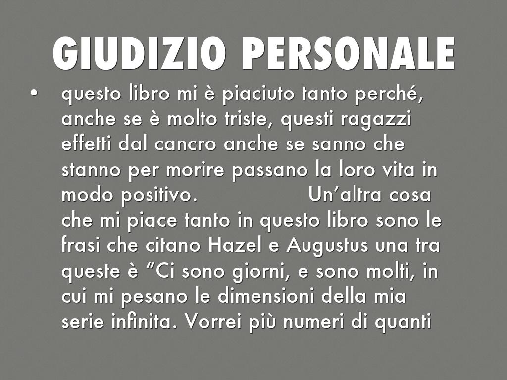 • questo libro mi è piaciuto tanto perché, anche se è molto triste, questi ragazzi effetti dal cancro anche se sanno che stanno per morire passano la loro vita in modo positivo. Un’altra cosa che mi piace tanto in questo libro sono le frasi che citano Hazel e Augustus una tra queste è “Ci sono giorni, e sono molti, in cui mi pesano le dimensioni della mia serie infinita. Vorrei più numeri di quanti è probabile che ne vivrò, e Dio, voglio più numeri per Augustus Waters di quelli che gli sono stati concessi. Ma Gus, amore mio, non riesco a dirti quanto ti sono grata per il nostro piccolo infinito...”