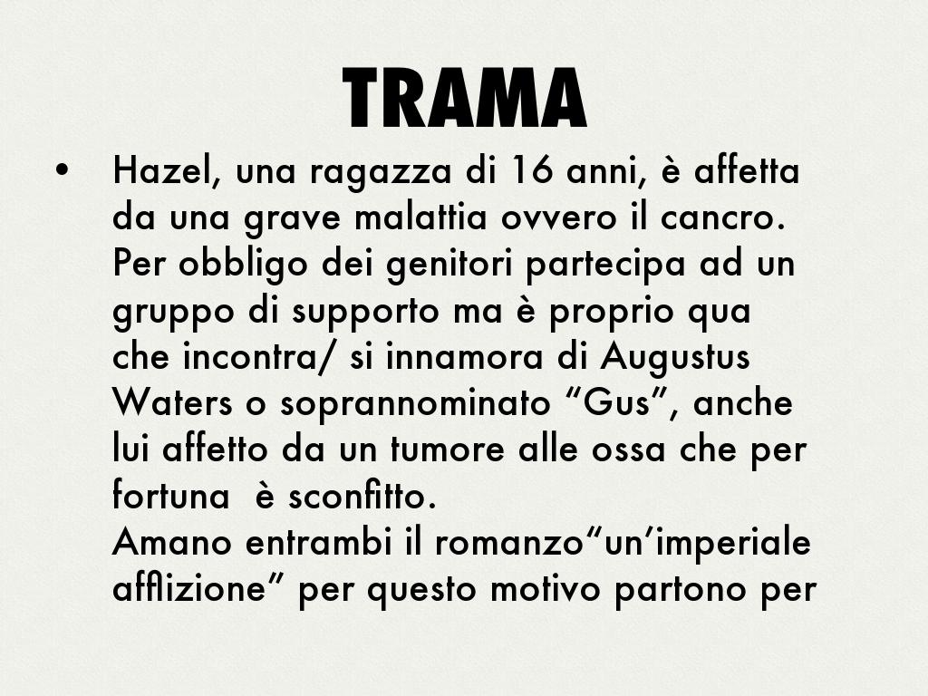 • Hazel, una ragazza di 16 anni, è affetta da una grave malattia ovvero il cancro. Per obbligo dei genitori partecipa ad un gruppo di supporto ma è proprio qua che incontra/ si innamora di Augustus Waters o soprannominato “Gus”, anche lui affetto da un tumore alle ossa che per fortuna è sconfitto. Amano entrambi il romanzo“un’imperiale afflizione” per questo motivo partono per Amsterdam per incontrare lo scrittore, che era ormai alcolizzato. Ma proprio la, ad Amsterdam, Gus rivela ad Hazel che si trova in fin di vita.