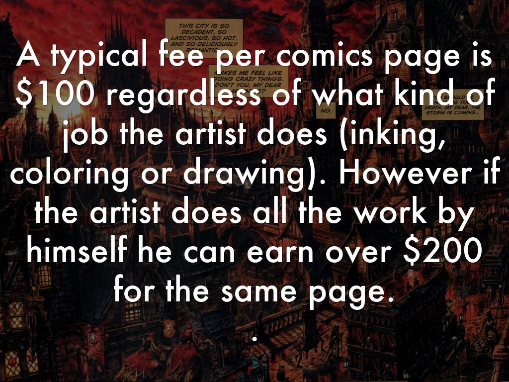 A typical fee per comics page is $100 regardless of what kind of job the artist does (inking, coloring or drawing). However if the artist does all the work by himself he can earn over $200 for the same page.
