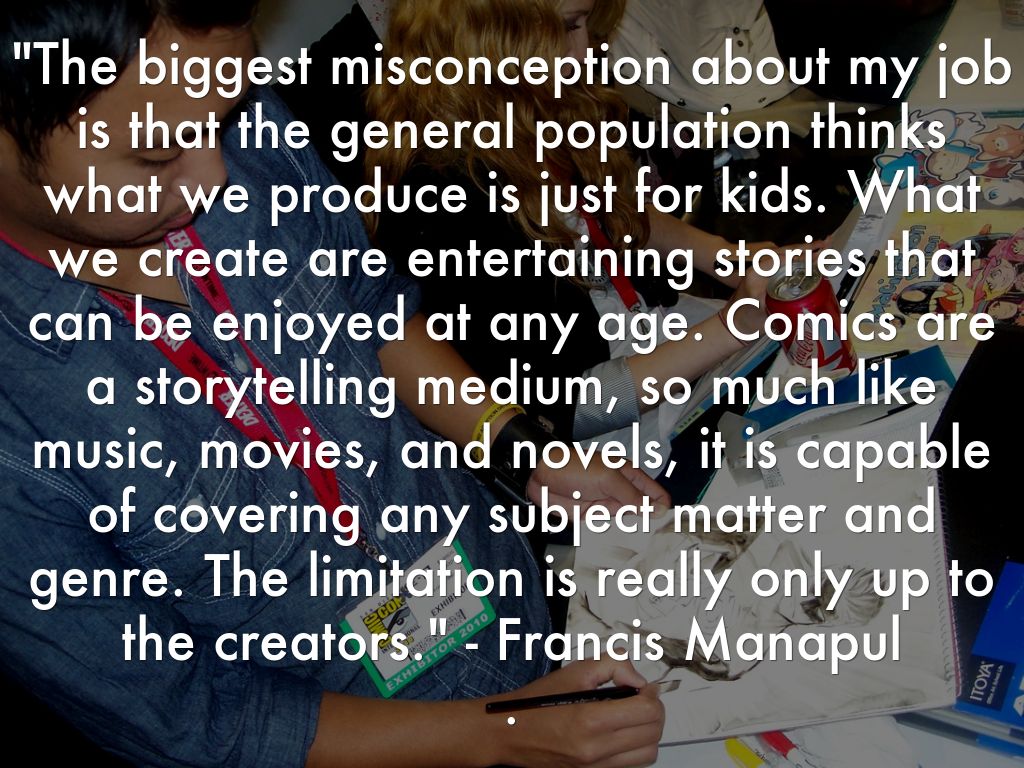 "The biggest misconception about my job is that the general population thinks what we produce is just for kids. What we create are entertaining stories that can be enjoyed at any age. Comics are a storytelling medium, so much like music, movies, and novels, it is capable of covering any subject matter and genre. The limitation is really only up to the creators." - Francis Manapul