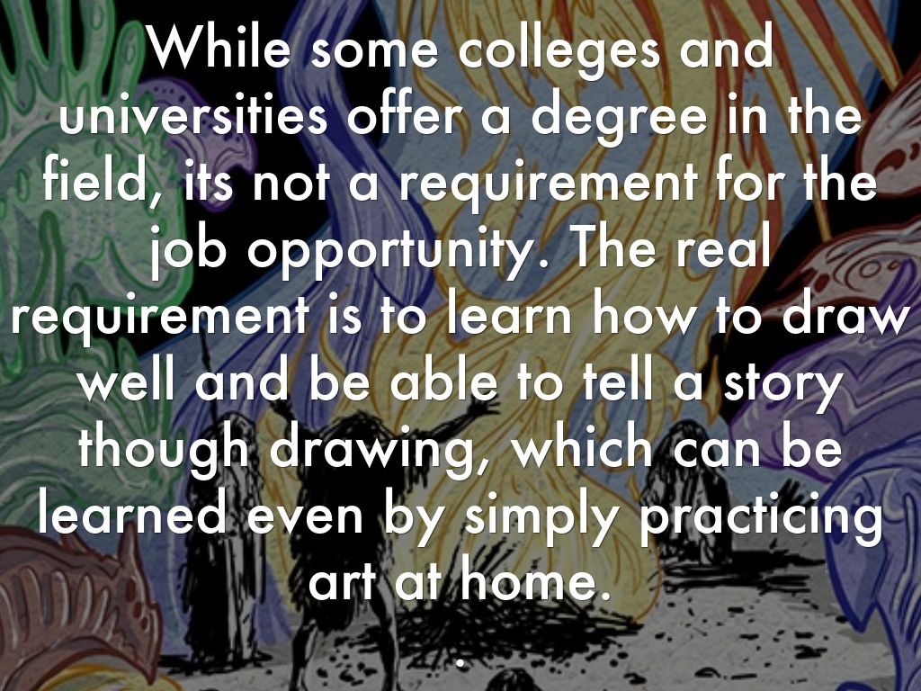 While some colleges and universities offer a degree in the field, its not a requirement for the job opportunity. The real requirement is to learn how to draw well and be able to tell a story though drawing, which can be learned even by simply practicing art at home.