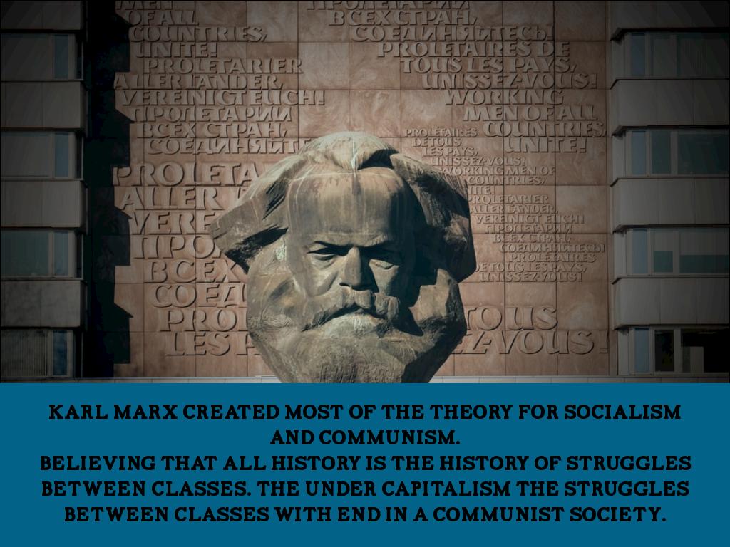 Karl Marx created most of the theory for Socialism and Communism. Believing that all history is the history of struggles between classes. The under capitalism the struggles between classes with end in a communist society.