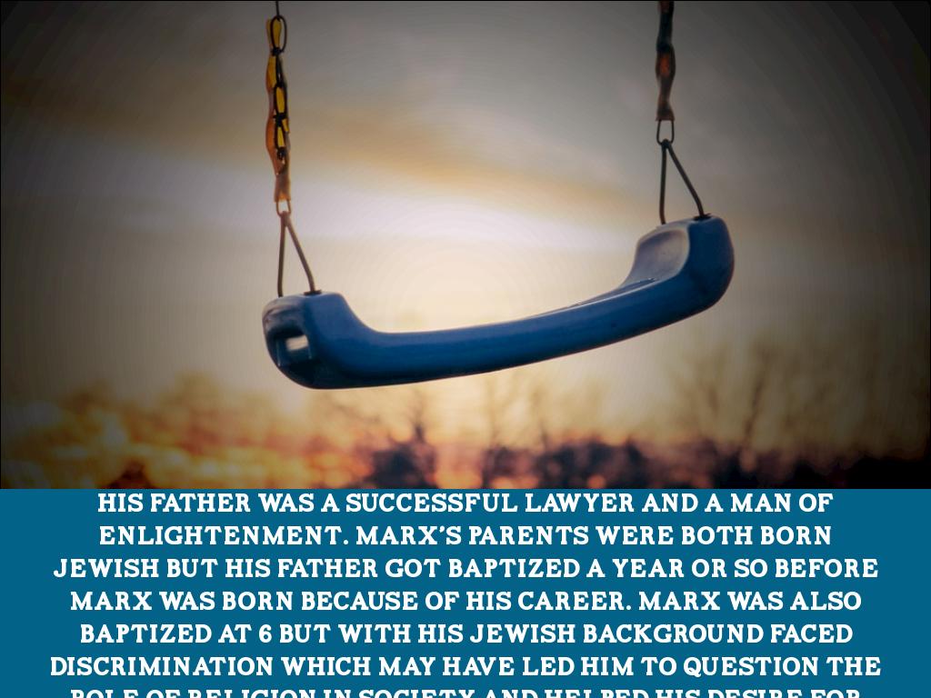 His father was a successful lawyer and a man of enlightenment. Marx’s parents were both born Jewish but his father got baptized a year or so before Marx was born because of his career. Marx was also baptized at 6 but with his Jewish background faced discrimination which may have led him to question the role of religion in society and helped his desire for social change.