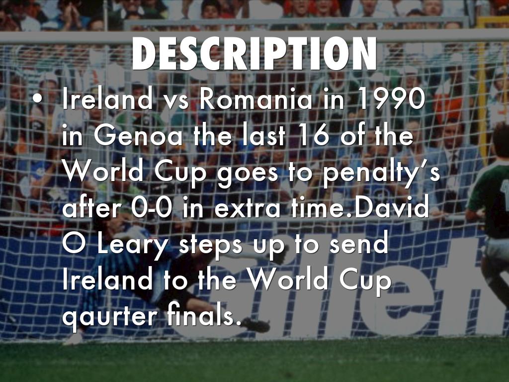 Ireland vs Romania in 1990 in Genoa the last 16 of the World Cup goes to penalty’s after 0-0 in extra time.David O Leary steps up to send Ireland to the World Cup qaurter finals.