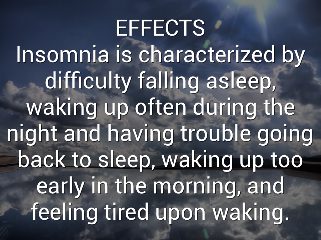 EFFECTS Insomnia is characterized by difficulty falling asleep, waking up often during the night and having trouble going back to sleep, waking up too early in the morning, and feeling tired upon waking.