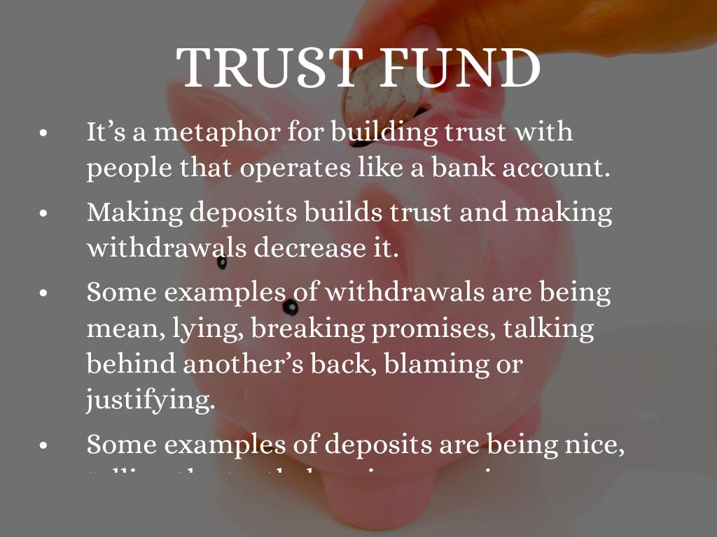 Some examples of withdrawals are being mean, lying, breaking promises, talking behind another’s back, blaming or justifying.