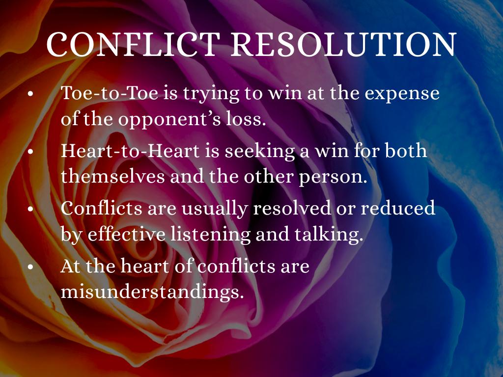 Conflicts are usually resolved or reduced by effective listening and talking.
