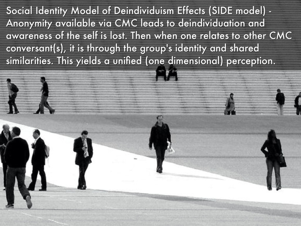 Social Identity Model of Deindividuism Effects (SIDE model) - Anonymity available via CMC leads to deindividuation and awareness of the self is lost. Then when one relates to other CMC conversant(s), it is through the group's identity and shared similarities. This yields a unified (one dimensional) perception.