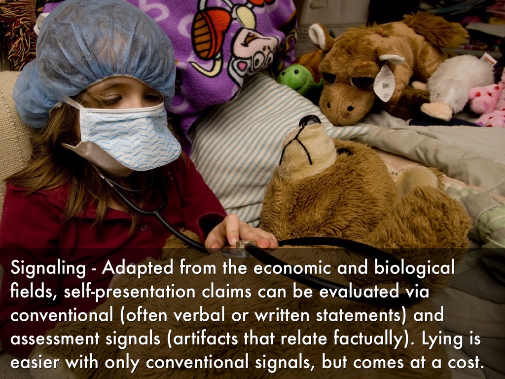 Signaling - Adapted from the economic and biological fields, self-presentation claims can be evaluated via conventional (often verbal or written statements) and assessment signals (artifacts that relate factually). Lying is easier with only conventional signals, but comes at a cost.