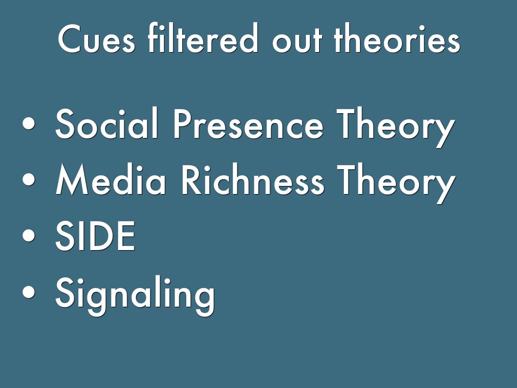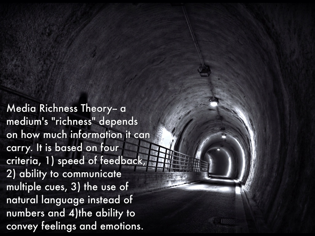 Media Richness Theory-- a medium's "richness" depends on how much information it can carry. It is based on four criteria, 1) speed of feedback, 2) ability to communicate multiple cues, 3) the use of natural language instead of numbers and 4)the ability to convey feelings and emotions.