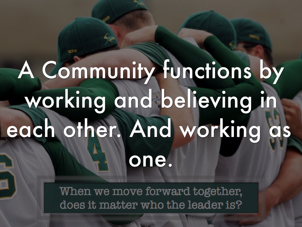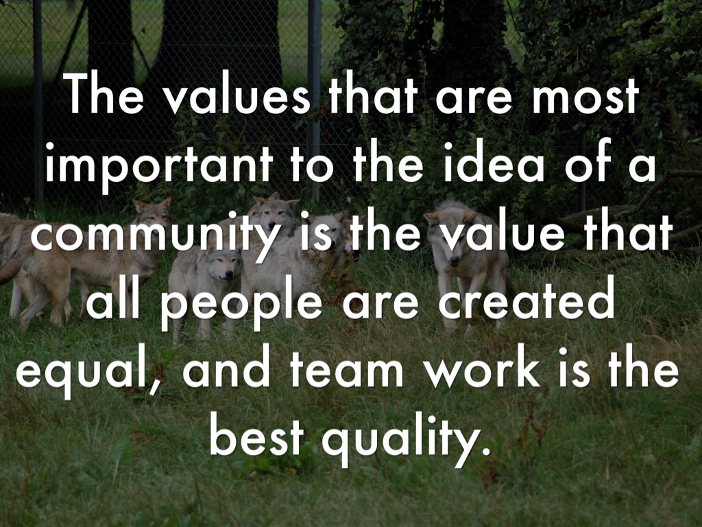 The values that are most important to the idea of a community is the value that all people are created equal, and team work is the best quality.