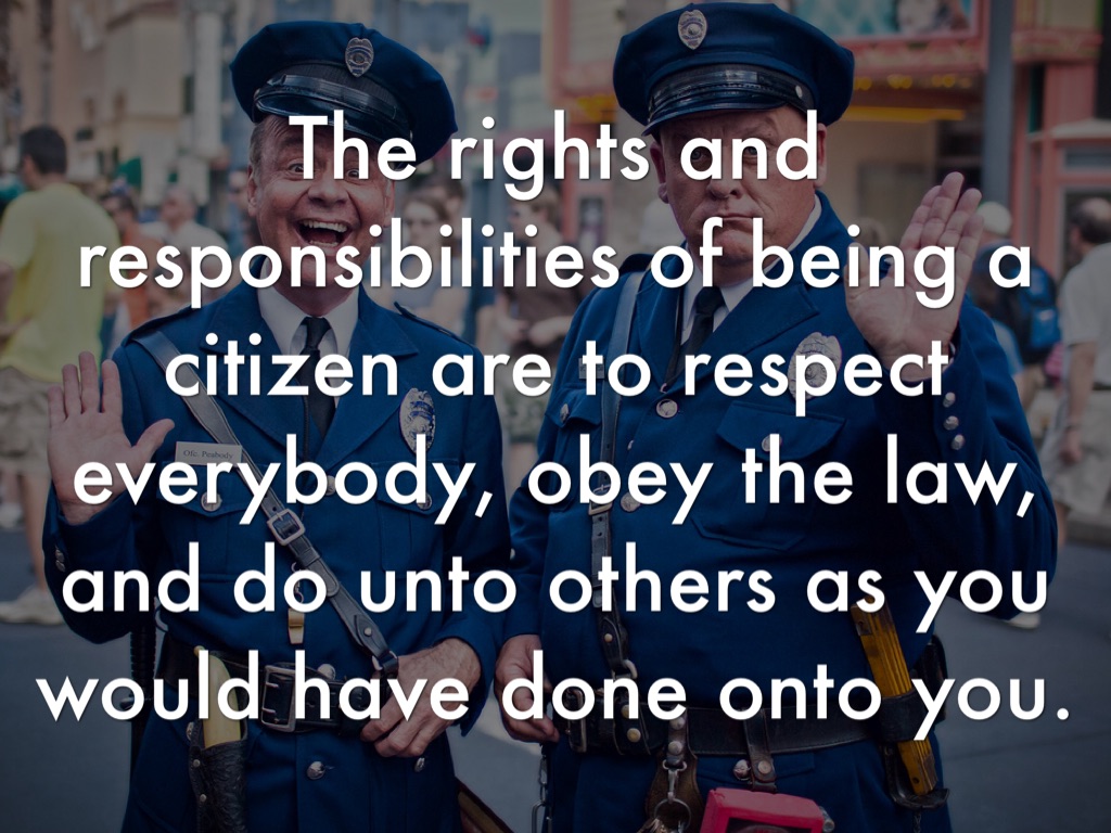 The rights and responsibilities of being a citizen are to respect everybody, obey the law, and do unto others as you would have done onto you.