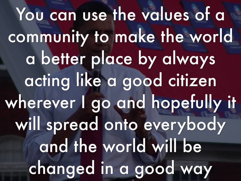 You can use the values of a community to make the world a better place by always acting like a good citizen wherever I go and hopefully it will spread onto everybody and the world will be changed in a good way