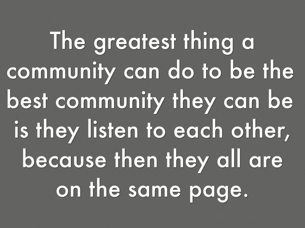 The greatest thing a community can do to be the best community they can be is they listen to each other, because then they all are on the same page.