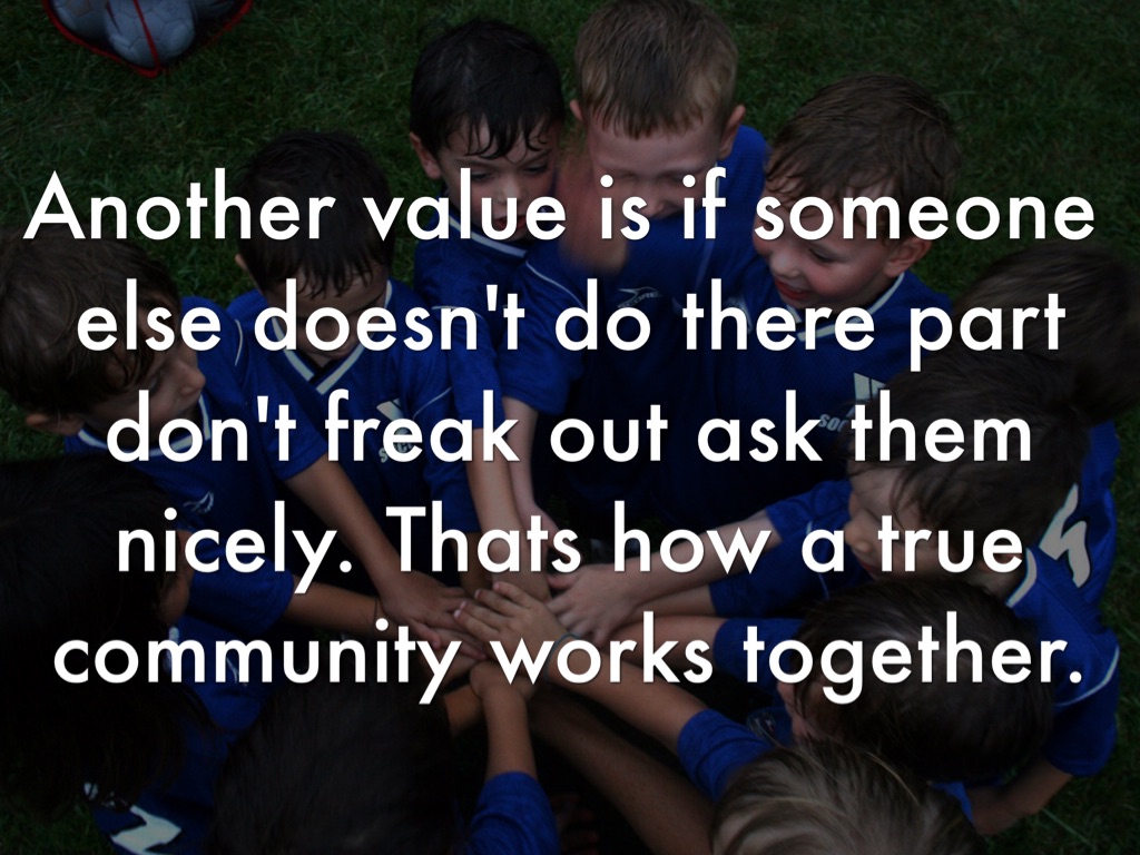 Another value is if someone else doesn't do there part don't freak out ask them nicely. Thats how a true community works together.