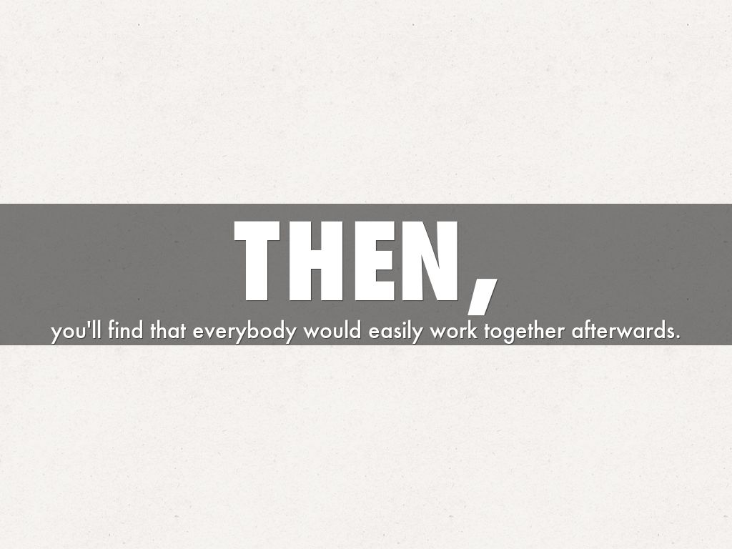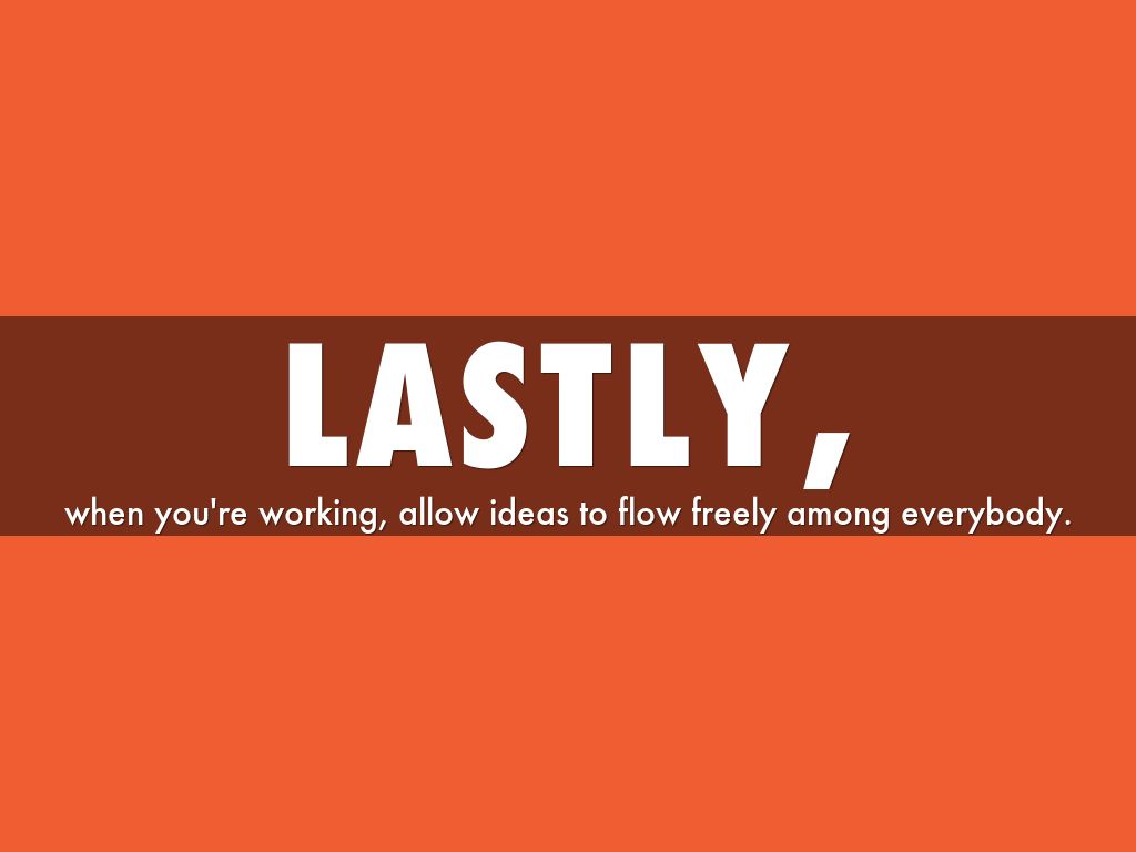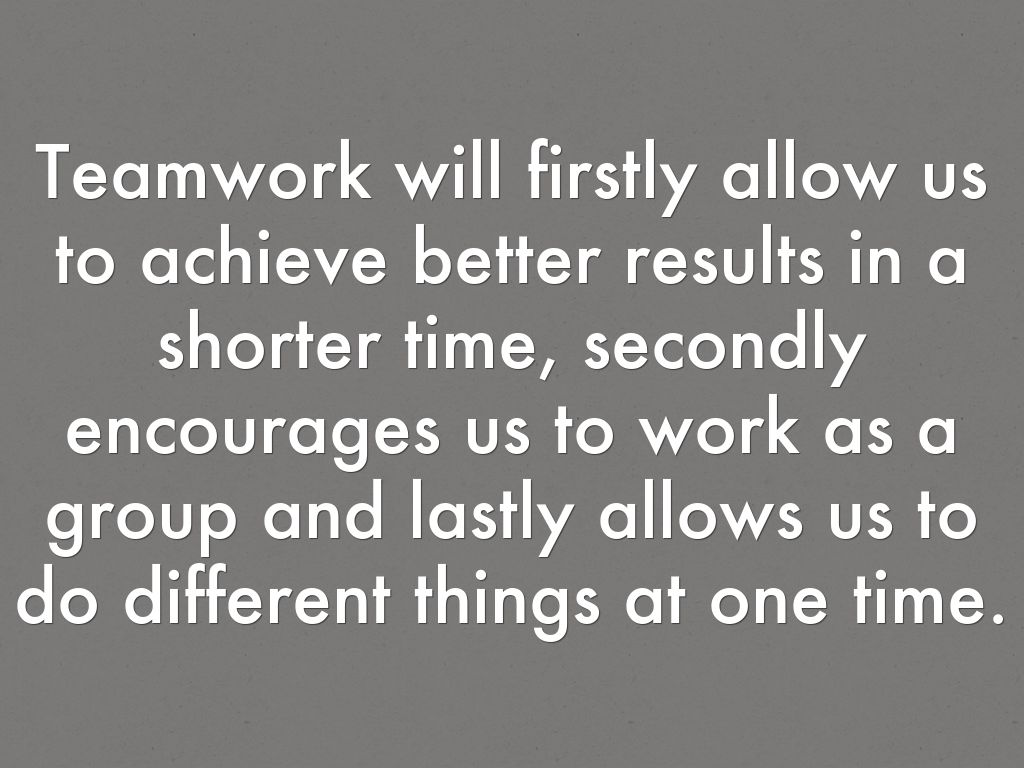 Teamwork will firstly allow us to achieve better results in a shorter time, secondly encourages us to work as a group and lastly allows us to do different things at one time.
