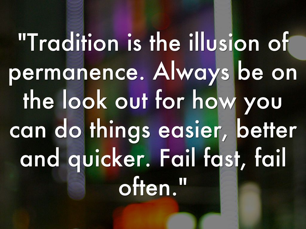 "Tradition is the illusion of permanence. Always be on the look out for how you can do things easier, better and quicker. Fail fast, fail often."