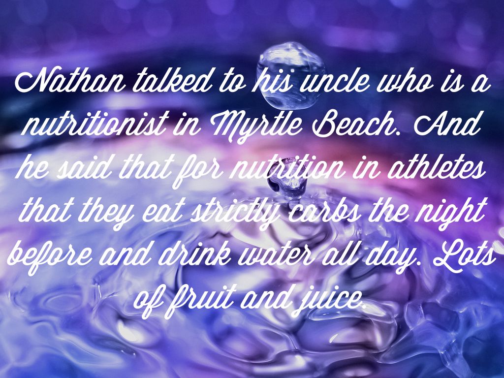 Nathan talked to his uncle who is a nutritionist in Myrtle Beach. And he said that for nutrition in athletes that they eat strictly carbs the night before and drink water all day. Lots of fruit and juice.
