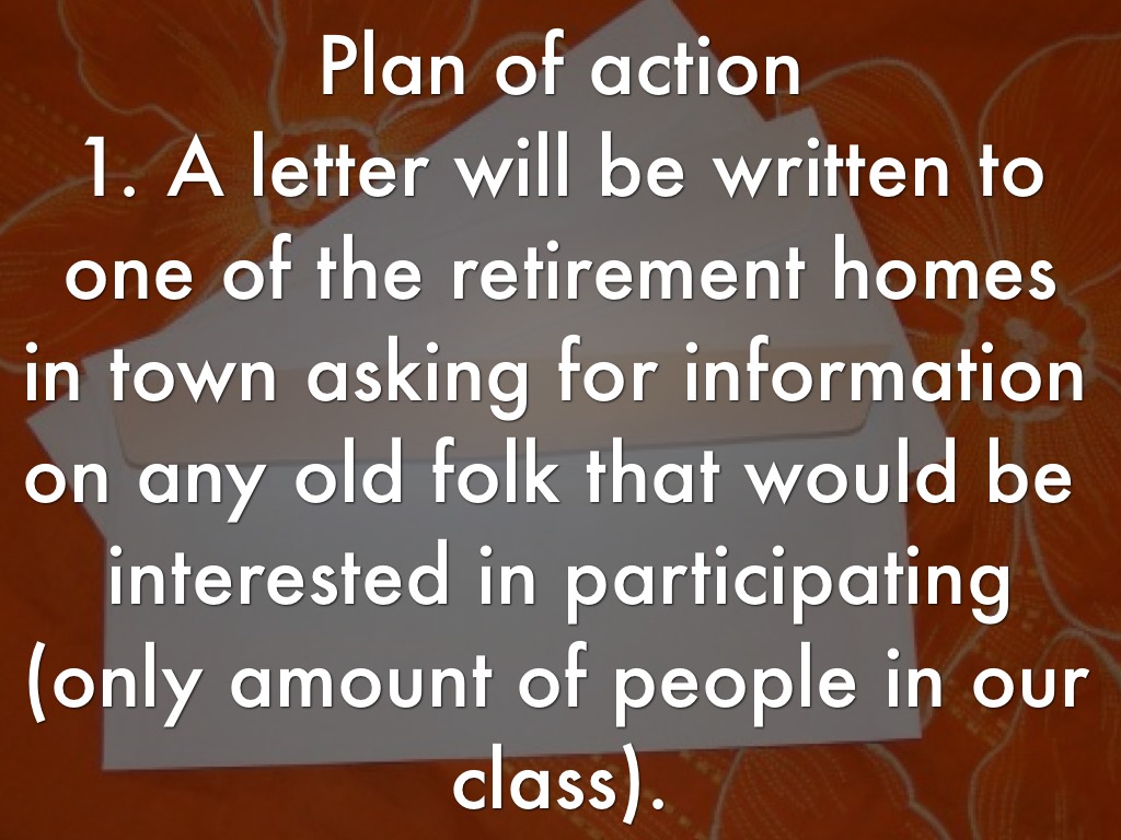 Plan of action 1. A letter will be written to one of the retirement homes in town asking for information on any old folk that would be interested in participating (only amount of people in our class).