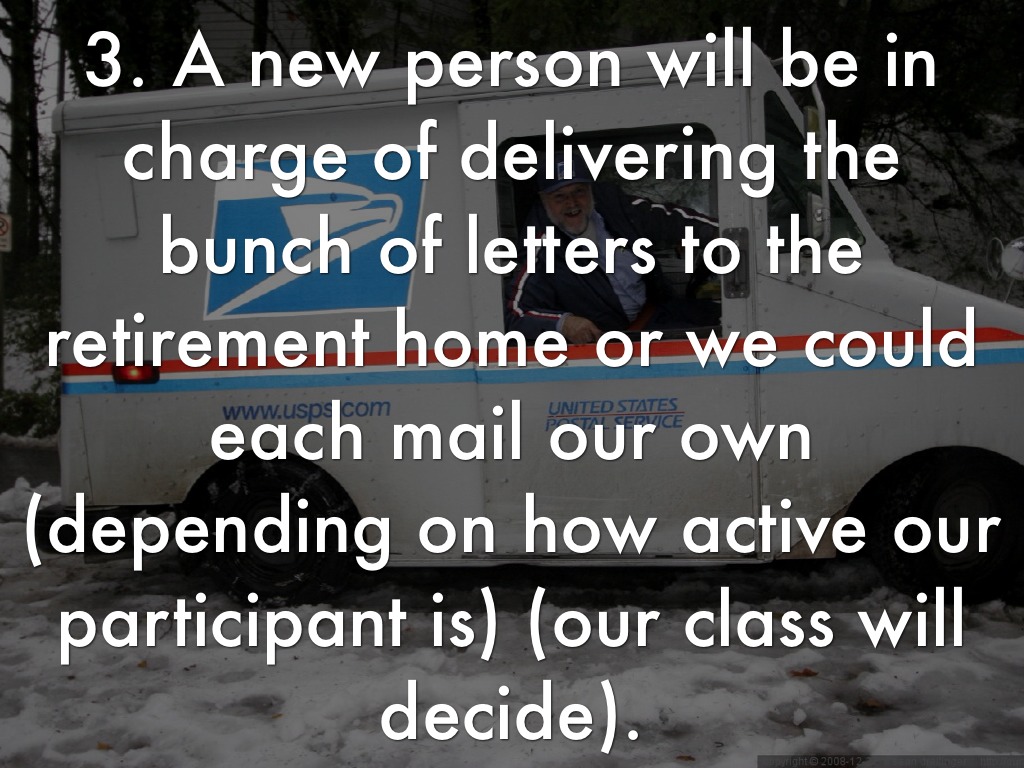3. A new person will be in charge of delivering the bunch of letters to the retirement home or we could each mail our own (depending on how active our participant is) (our class will decide).