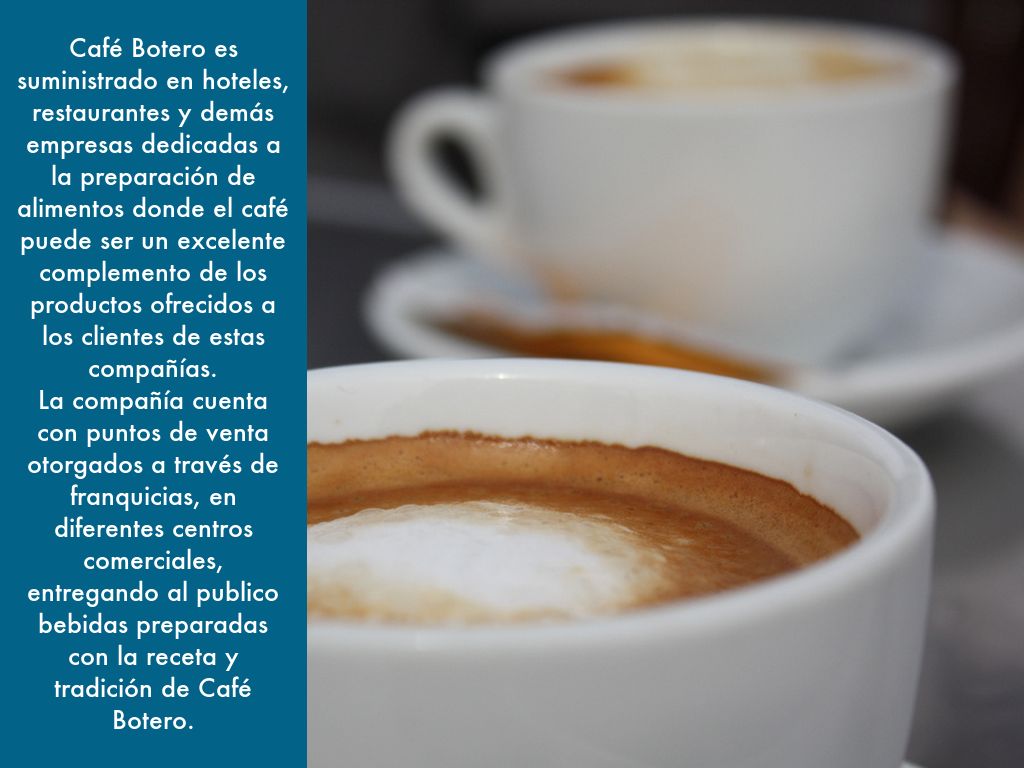 La compañía cuenta con puntos de venta otorgados a través de franquicias, en diferentes centros comerciales, entregando al publico bebidas preparadas con la receta y tradición de Café Botero.