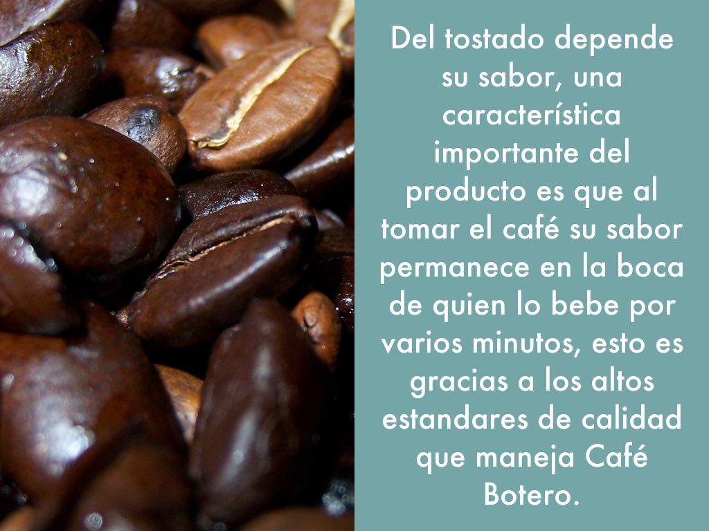 Del tostado depende su sabor, una característica importante del producto es que al tomar el café su sabor permanece en la boca de quien lo bebe por varios minutos, esto es gracias a los altos estandares de calidad que maneja Café Botero.